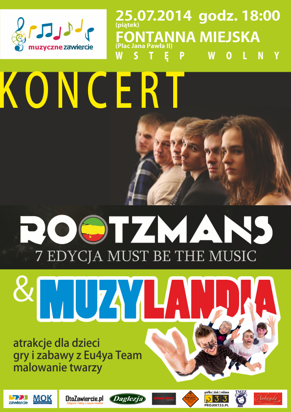 Wszystkich miłośników muzyki chcieliśmy serdecznie zaprosić w najbliższy piątek na fontannę miejską, na placu im. Jana Pawła II. W ramach projektu "Muzyczne Zawiercie" wystąpi zespół znany z 7 edycji "Must be the music", ROOTZMANS! Nie zabraknie także atrakcji dla dzieci i młodzieży.