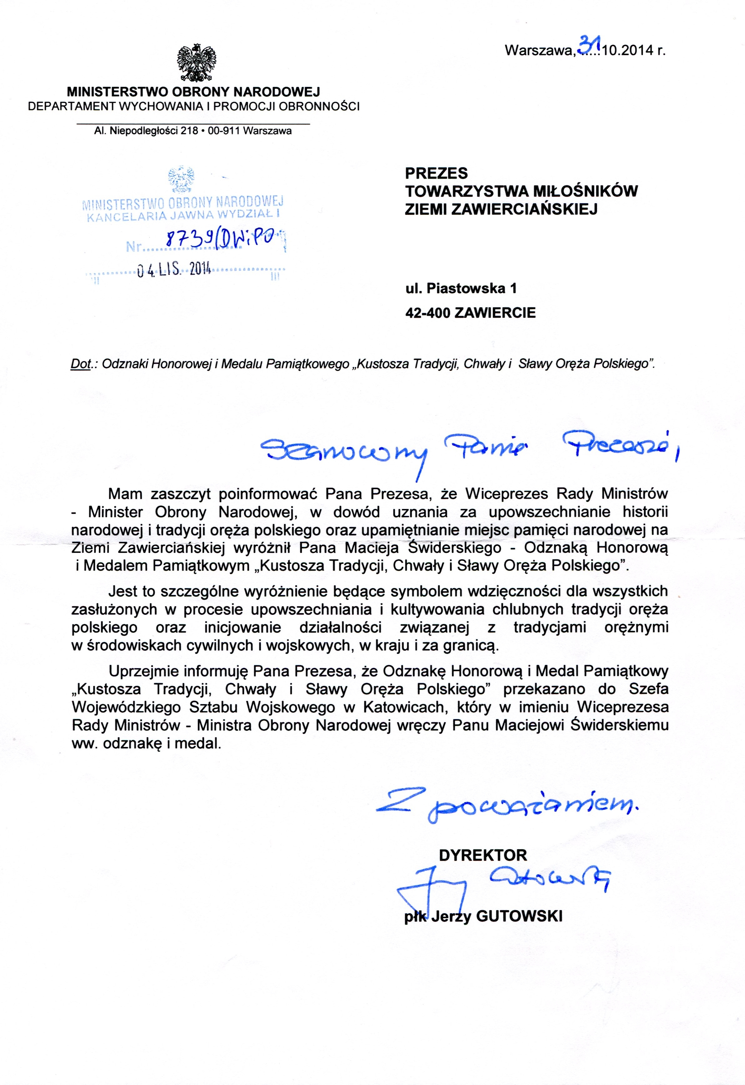 Towarzystwo Miłośników Ziemi Zawierciańskiej ma zaszczyt poinformować, że Wiceprezes Rady Ministrów - Minister Obrony Narodowej, w dowód uznania za upowszechnianie historii narodowej i tradycji oręża polskiego oraz upamiętnianie miejsc pamięci narodowej na Ziemi Zawierciańskiej wyróżnił Pana Macieja Świderskiego, sekretarza TMZZ - Odznaką Honorową i Medalem Pamiątkowym " Kustosza Tradycji, Chwały i Sławy Oręża Polskiego."