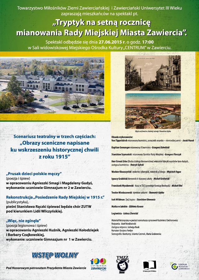 Towarzystwo Miłośników Ziemi Zawierciańskiej oraz Zawierciański Uniwersytet Trzeciego Wieku serdecznie zapraszają mieszkańców na spektakl pt. "Tryptyk na setną rocznicę mianowania Rady Miejskiej Miasta Zawiercia".