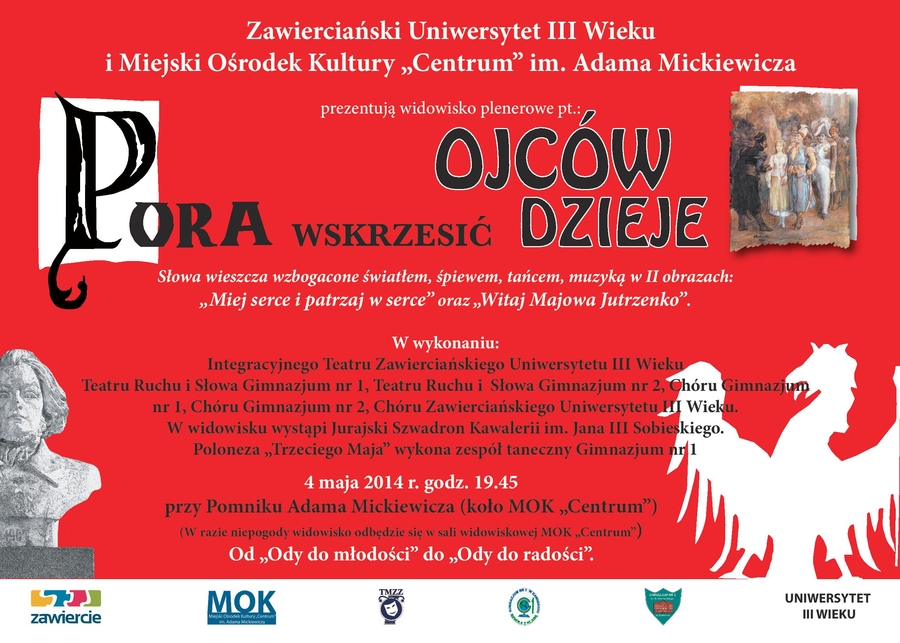Serdecznie zapraszamy do wzięcia udziału w przygotowanym przez Zawierciański Uniwersytet Trzeciego Wieku oraz Miejski Ośrodek Kultury "Centrum" im. Adama Mickiewicza w Zawierciu widowisku plenerowym pt.: "Pora Wskrzesić Ojców Dzieje". Spektakl odbędzie się 4 maja o godz. 19:45 przy pomniku Adama Mickiewicza (koło MOK "Centrum").